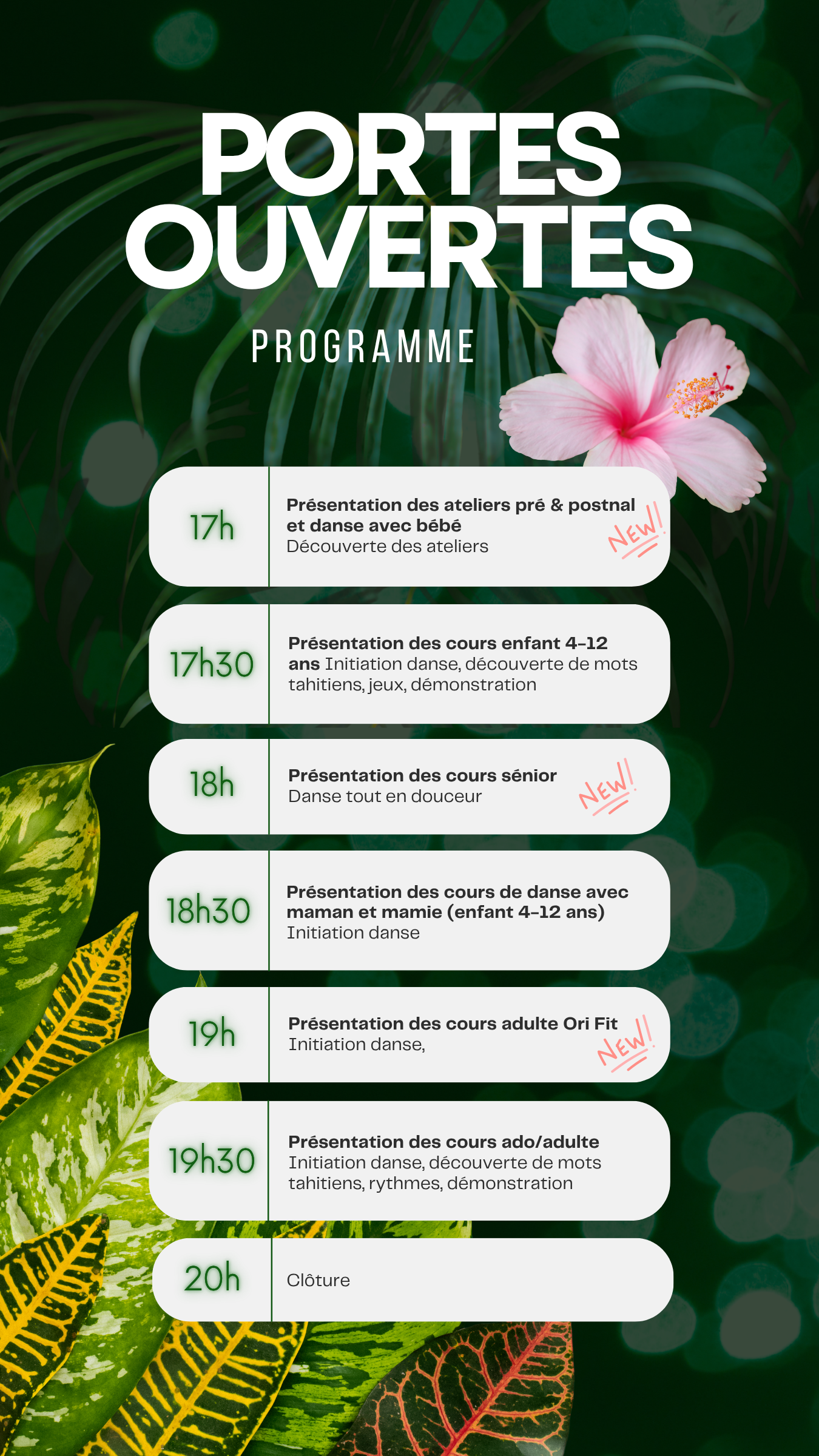 Danse pré & postnatale, danse avec bébé, danse avec maman et mamie, danse sénior, danse enfant, danse ado, danse adulte, adulte ori fit (cardio), atelier chorégraphique, etc. Il y a forcément un cours pour vous !!